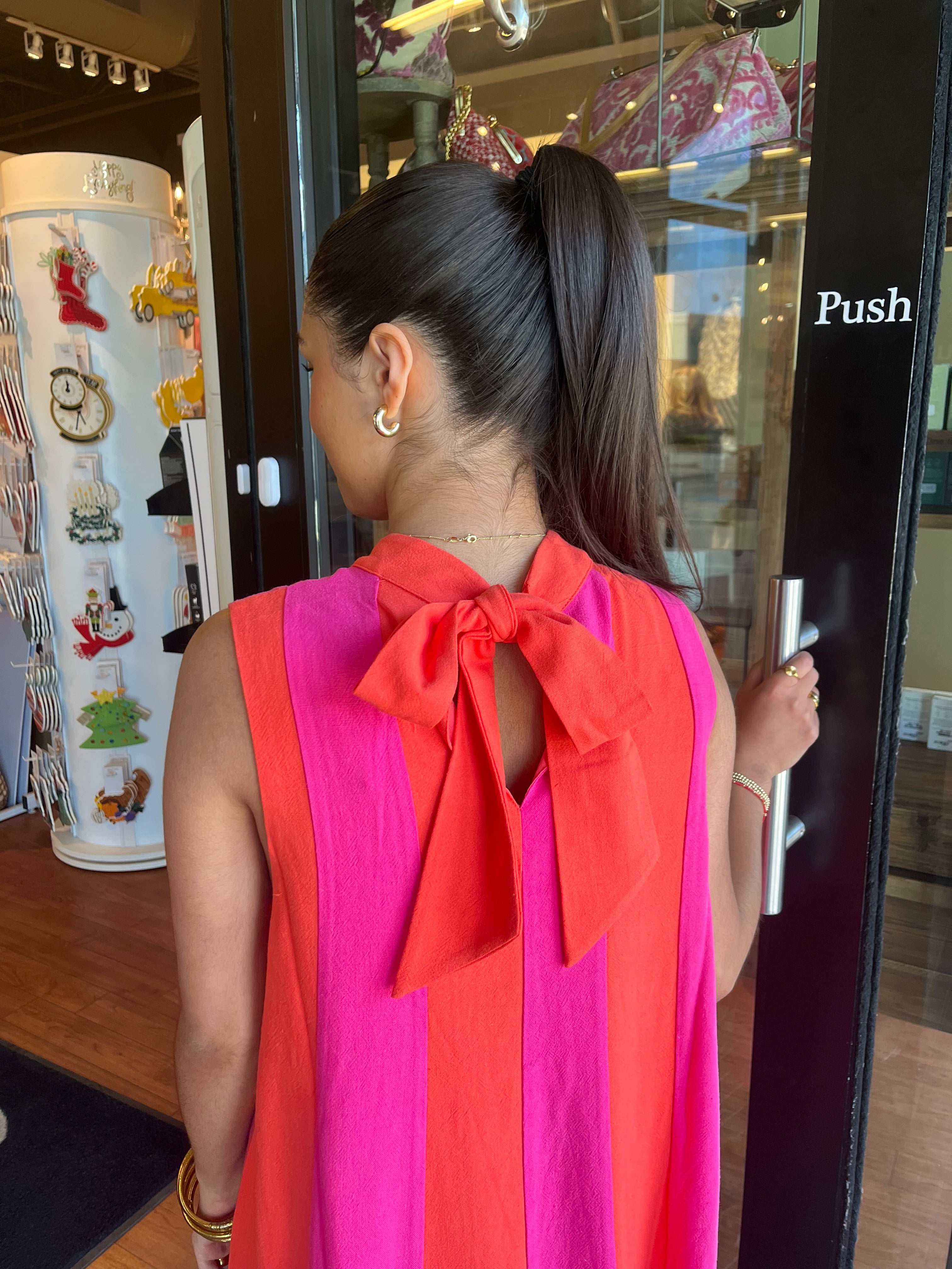 The Audrey Dress is a bright and trendy tank top dress made of high-quality linen material. Featuring a stylish tie back and keyhole design, this short dress is perfect for any occasion. Its vibrant pink and orange tones make it a must-have addition to your wardrobe.