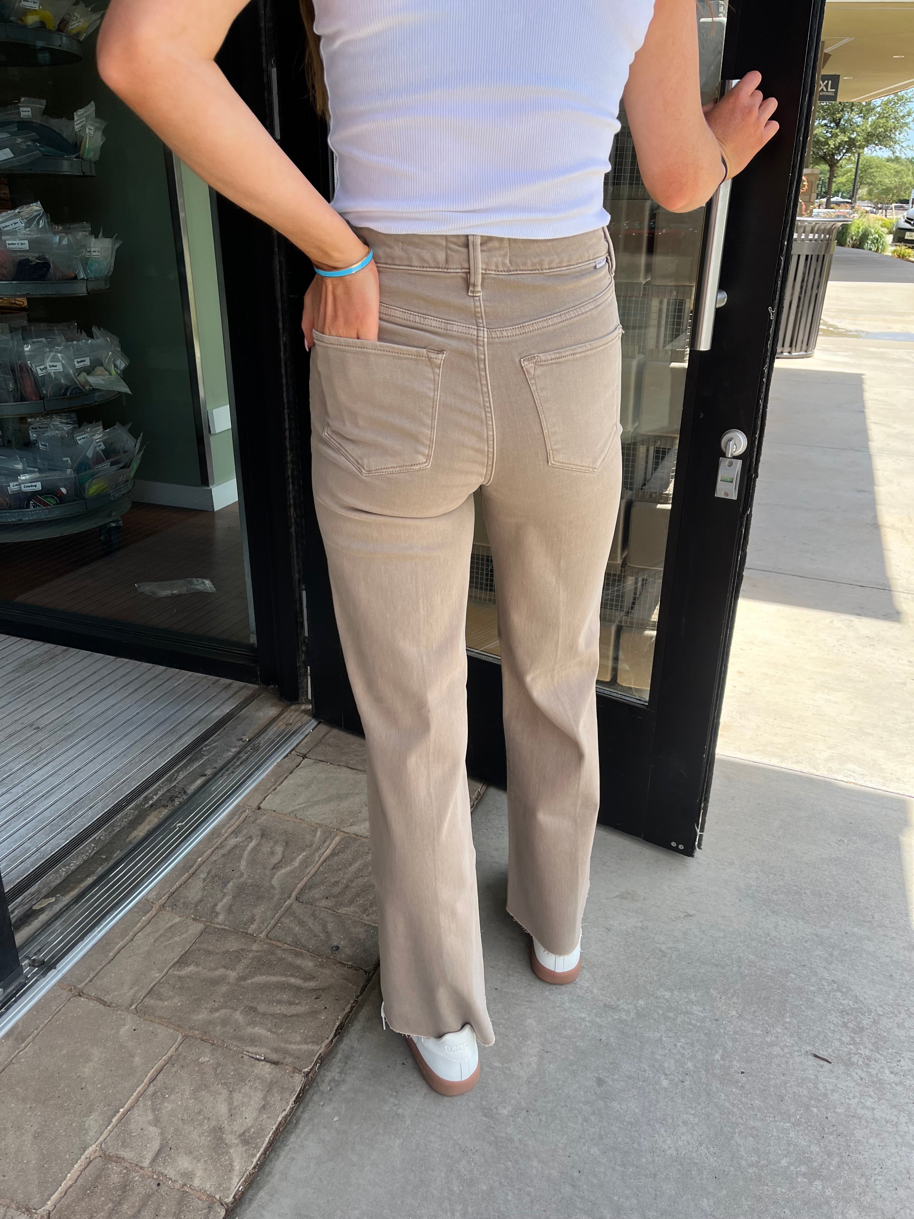 Step into fall with the Fiona Wide Leg Jeans in a chic neutral taupe. Their relaxed fit and raw hem add a playful edge, making them perfect for dressing up with heels or keeping it casual with sneakers. Cozy, stylish, and effortlessly versatile—these jeans are your new go-to for the season.