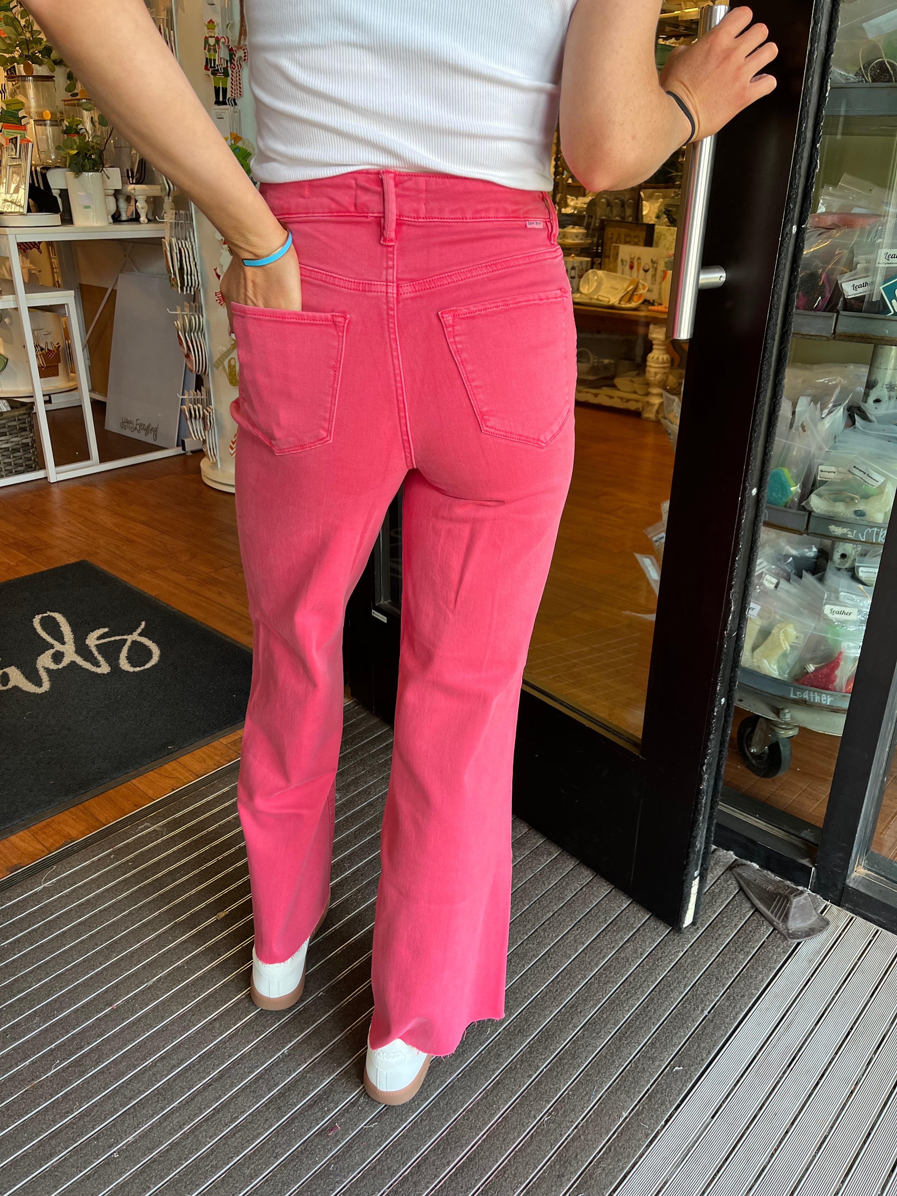 Step out in style with the Fiona Wide Leg Jeans in a vibrant raspberry hue. Crafted from stretchy, adaptable fabric, these jeans move with you for all-day comfort. The playful raw hem adds a trendy edge, making them perfect to pair with your favorite cute blouse for a fun, flirty look.