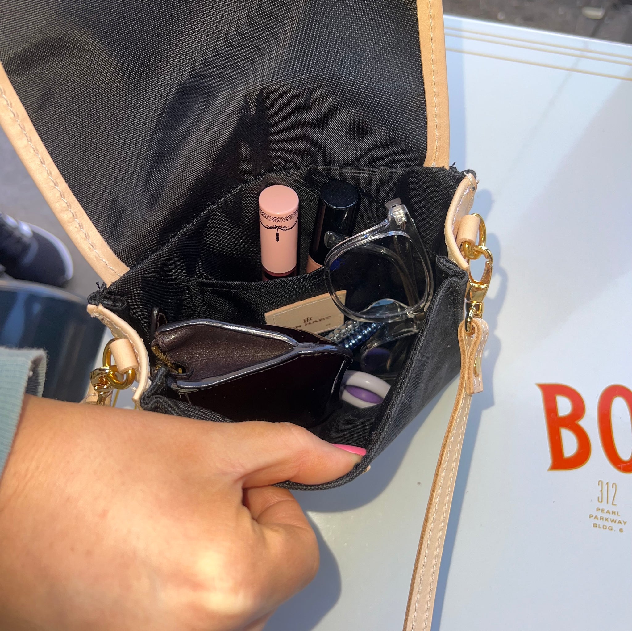 Introducing Lillie, the crossbody purse that combines practicality and charm effortlessly. With one interior slim open pocket, an exterior slim open pocket, a removable strap, and a secure magnetic clasp closure, it's the perfect companion for your essentials. The sleek black lining adds a touch of sophistication.