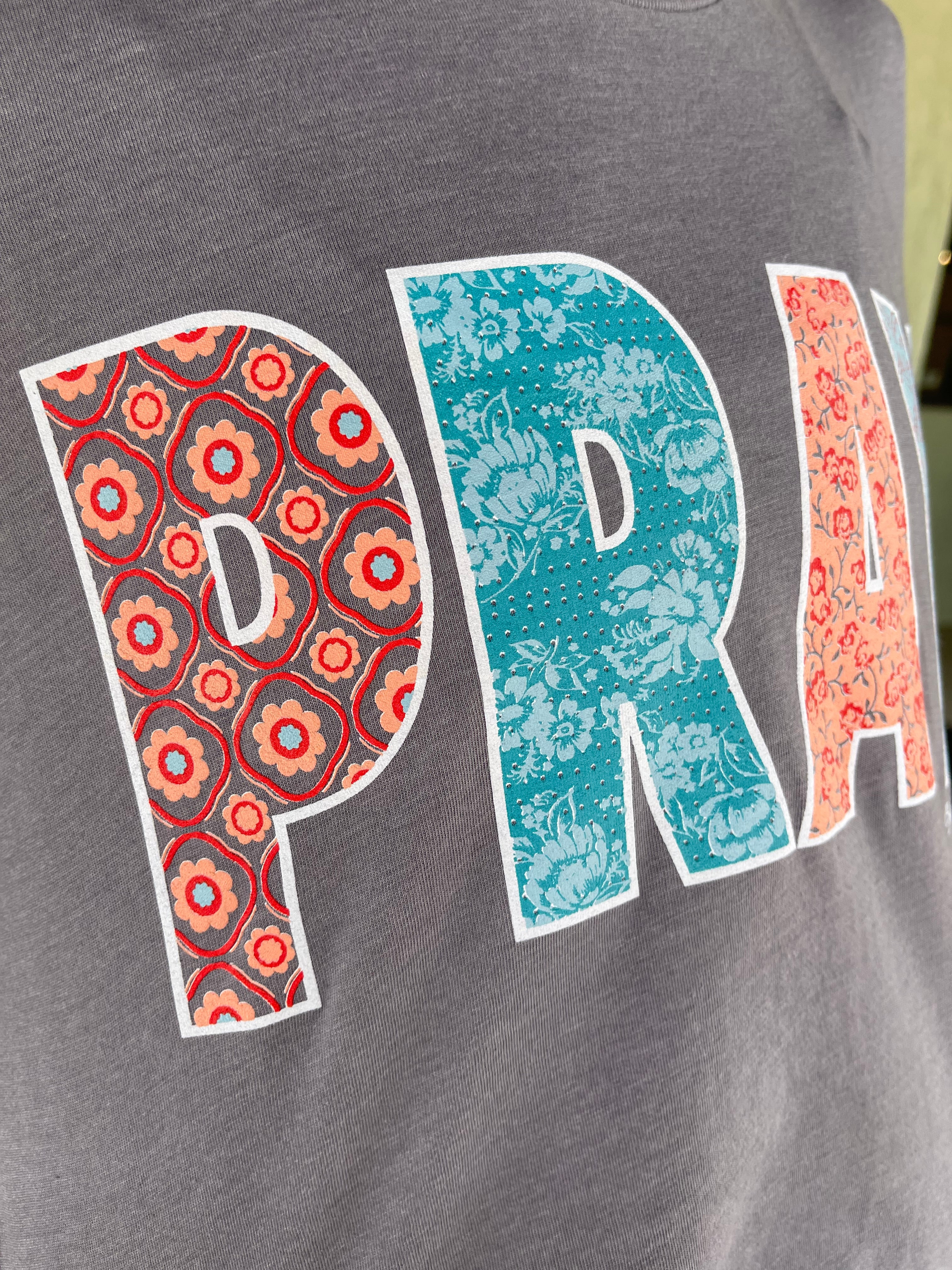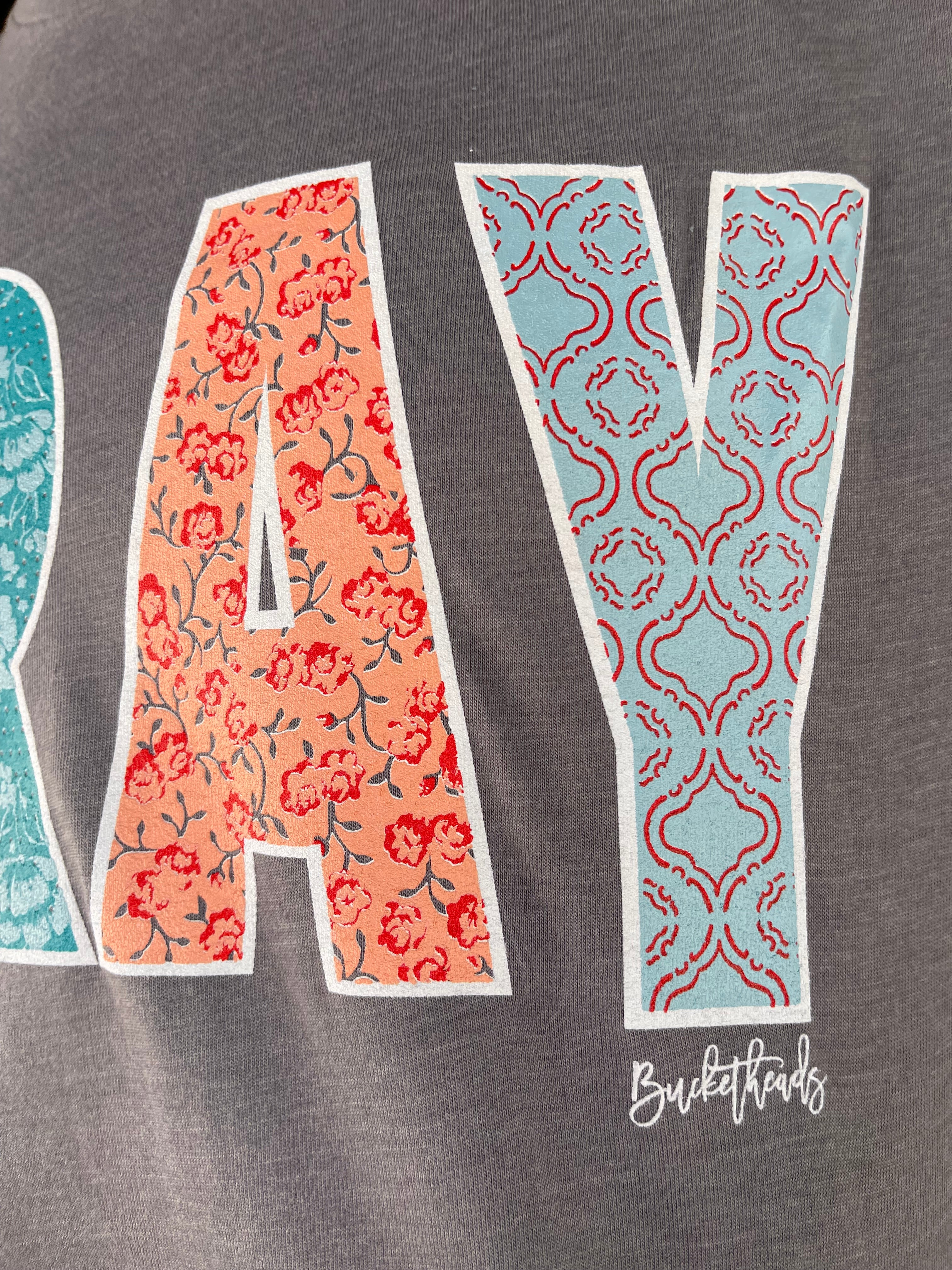 "Get ready for a funky new look with our PRAY Tee! Featuring bold letters with a funky print inside, this tee will have you standing out in style. So go ahead and let your personality shine with our new PRAY Tee. (No actual praying required!)"